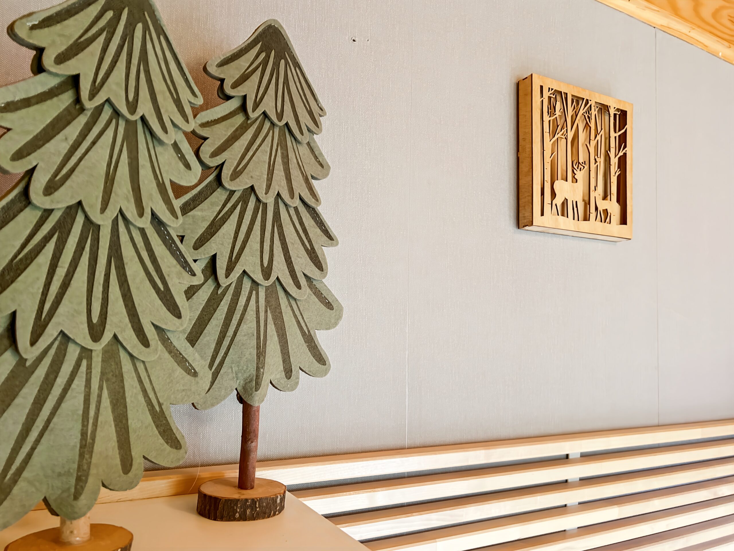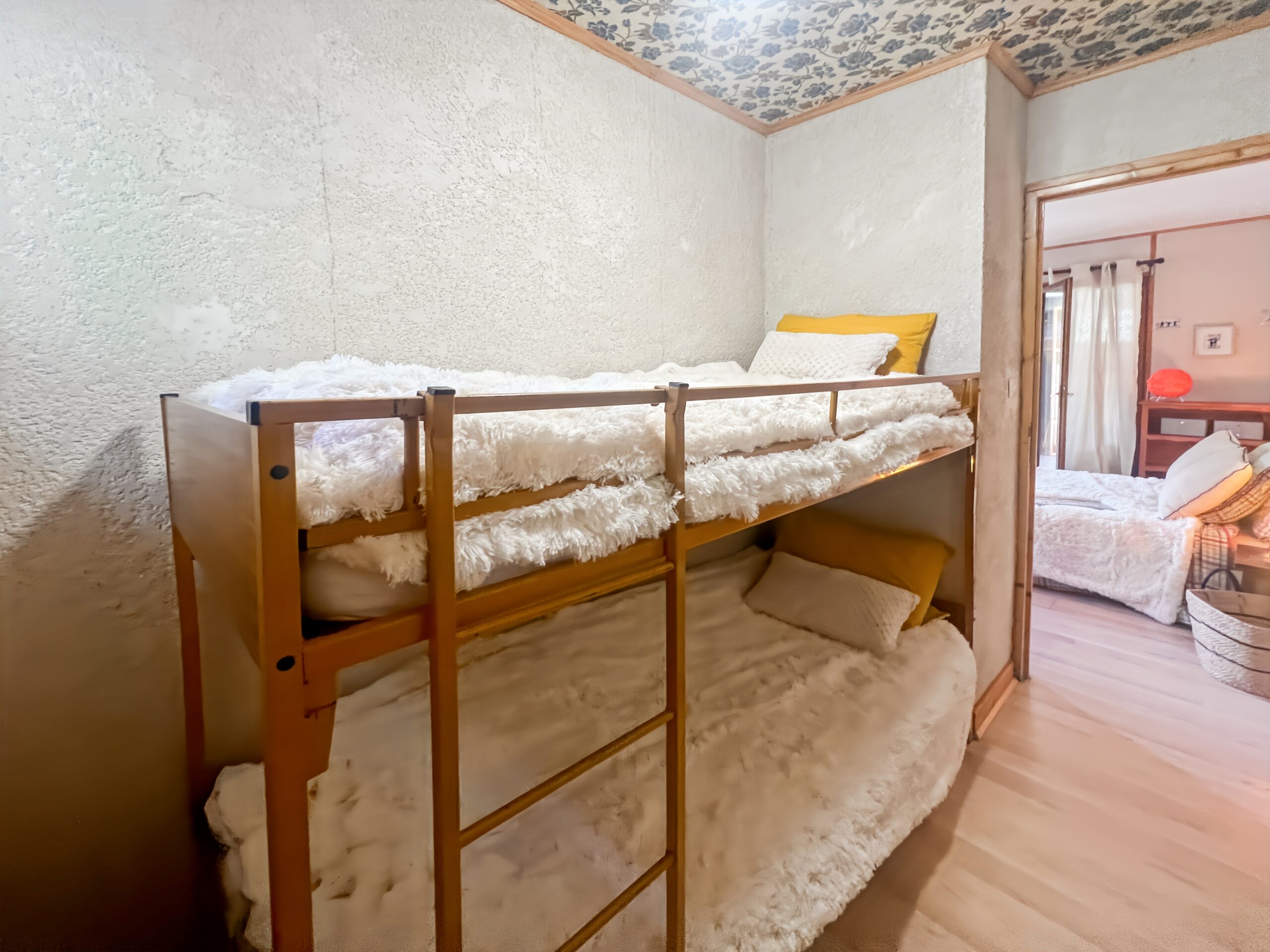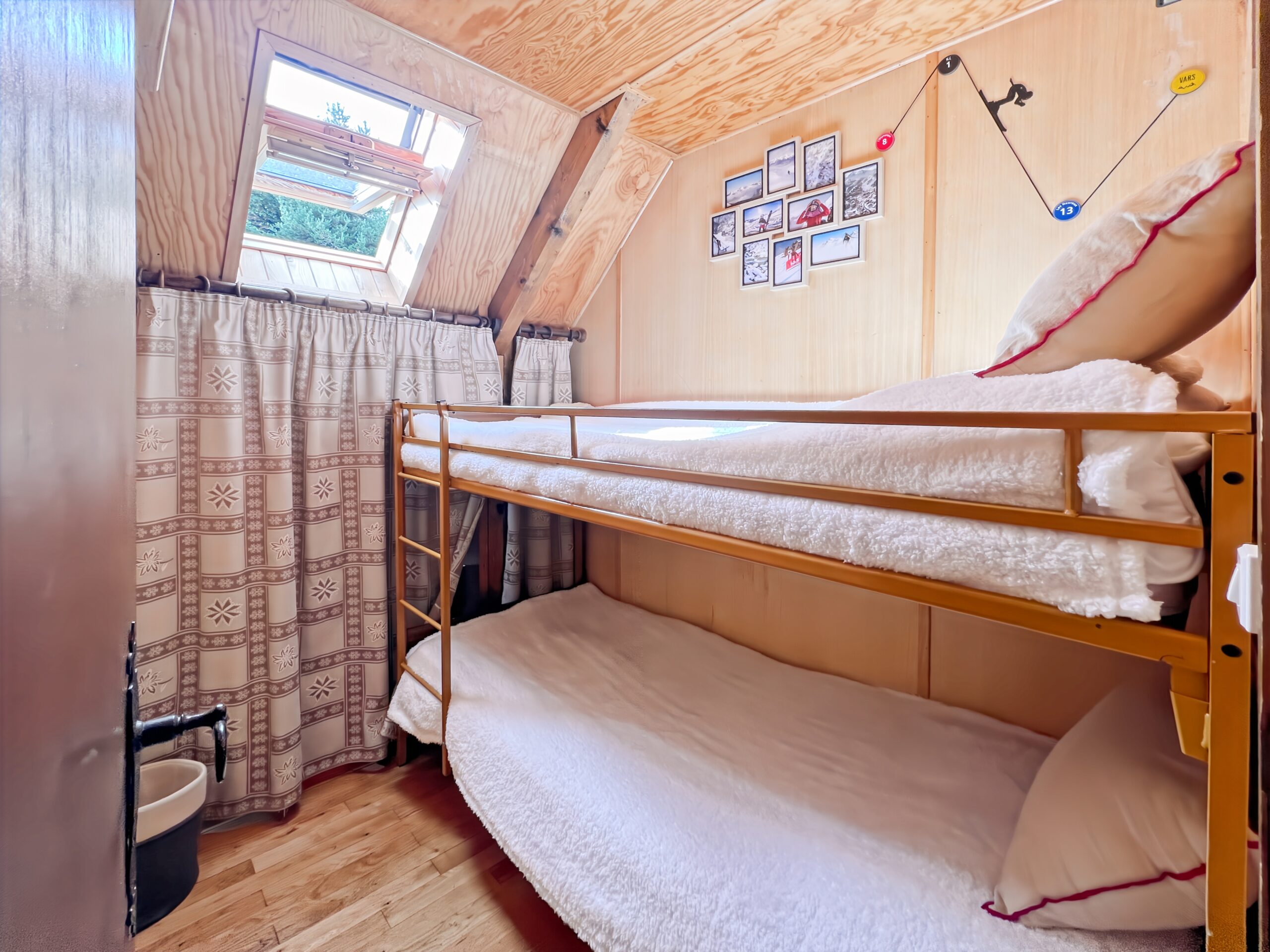 A l’étage : 1 chambre double « La Forêt blanche », 1 chambre junior avec lit superposés « La Hors pistes ».