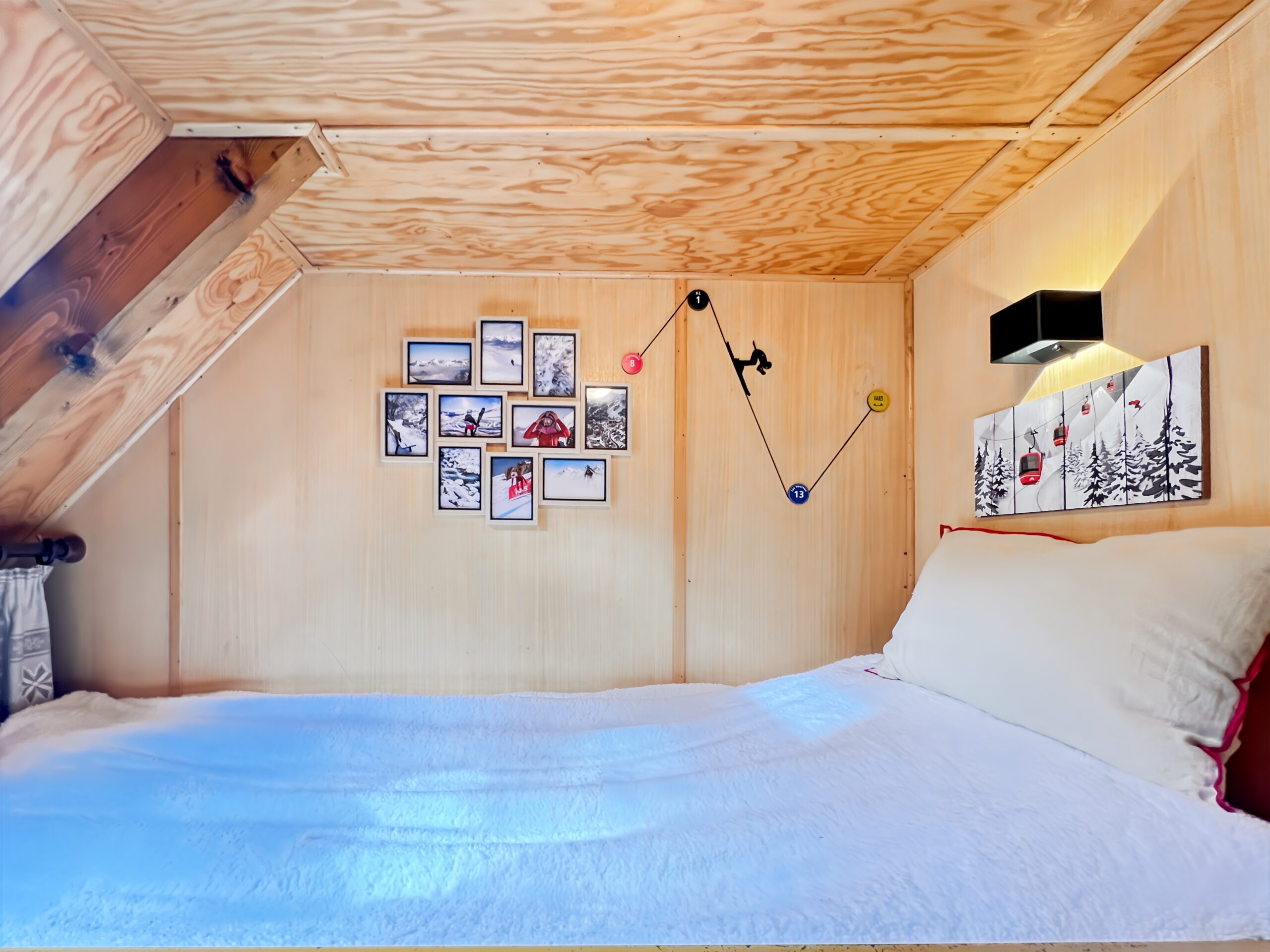 Pour compléter un espace en mezzanine avec 2 lits simples pour le coin cabane des enfants pour l’après ski ou des couchages complémentaires.
