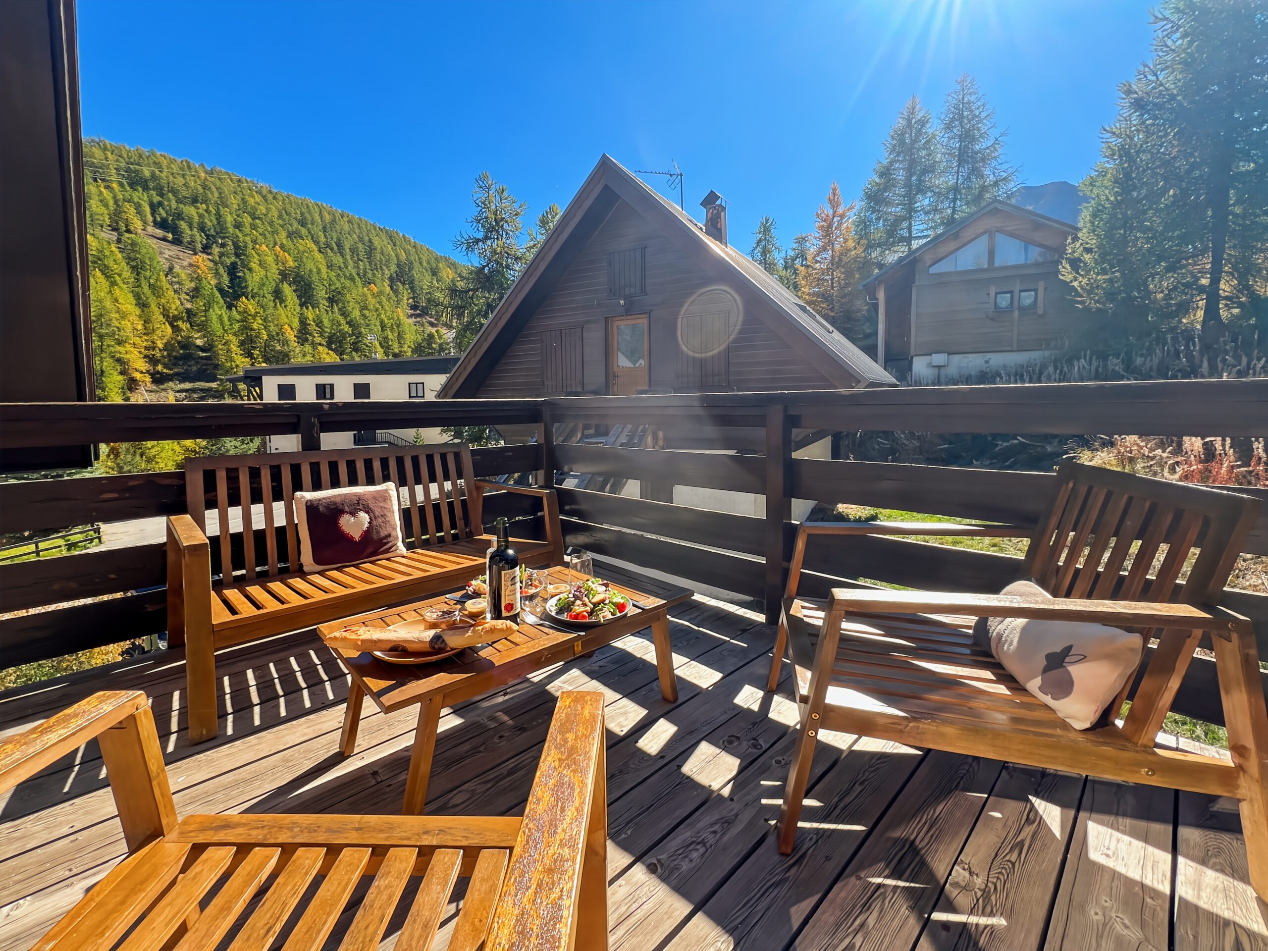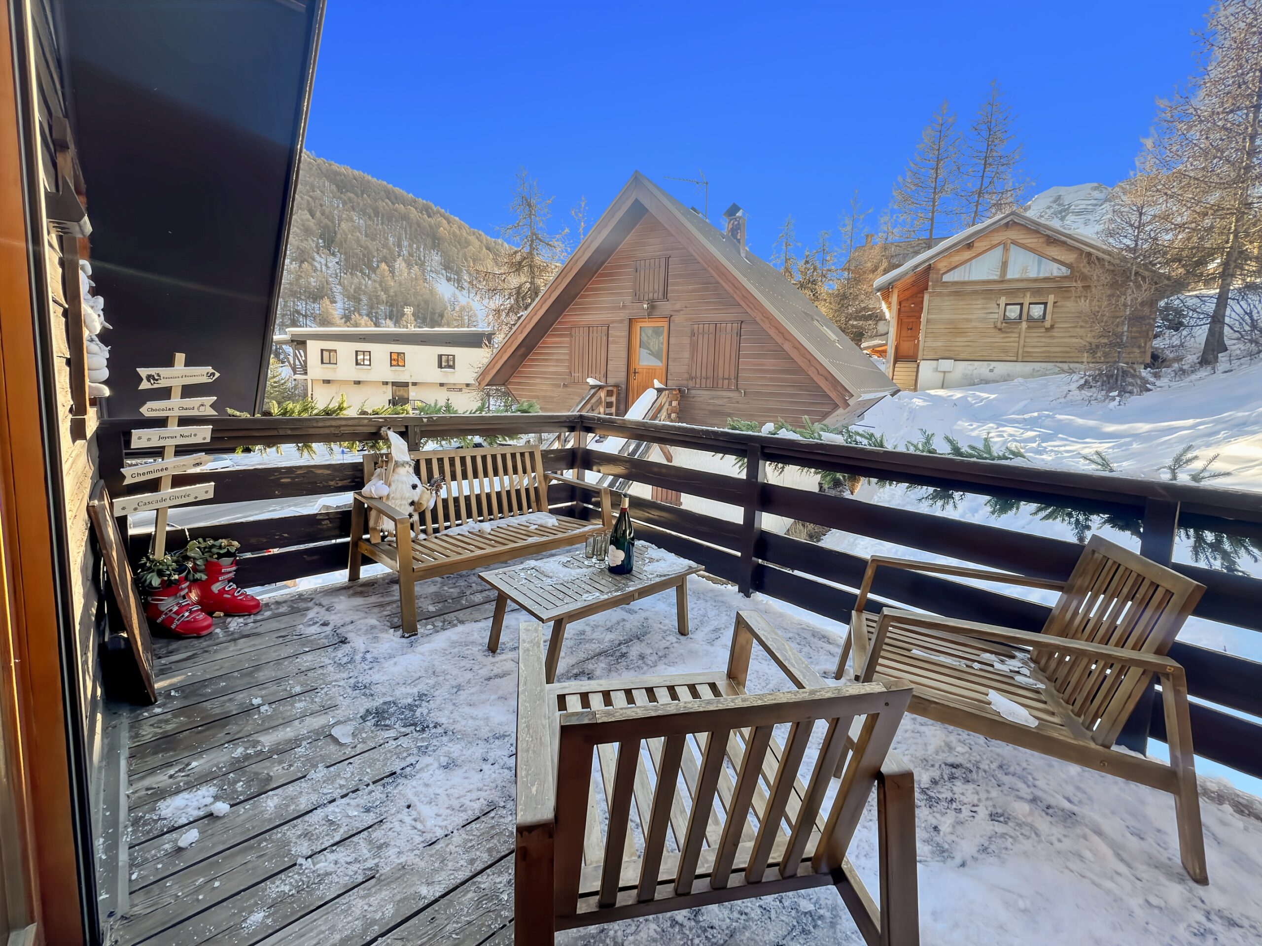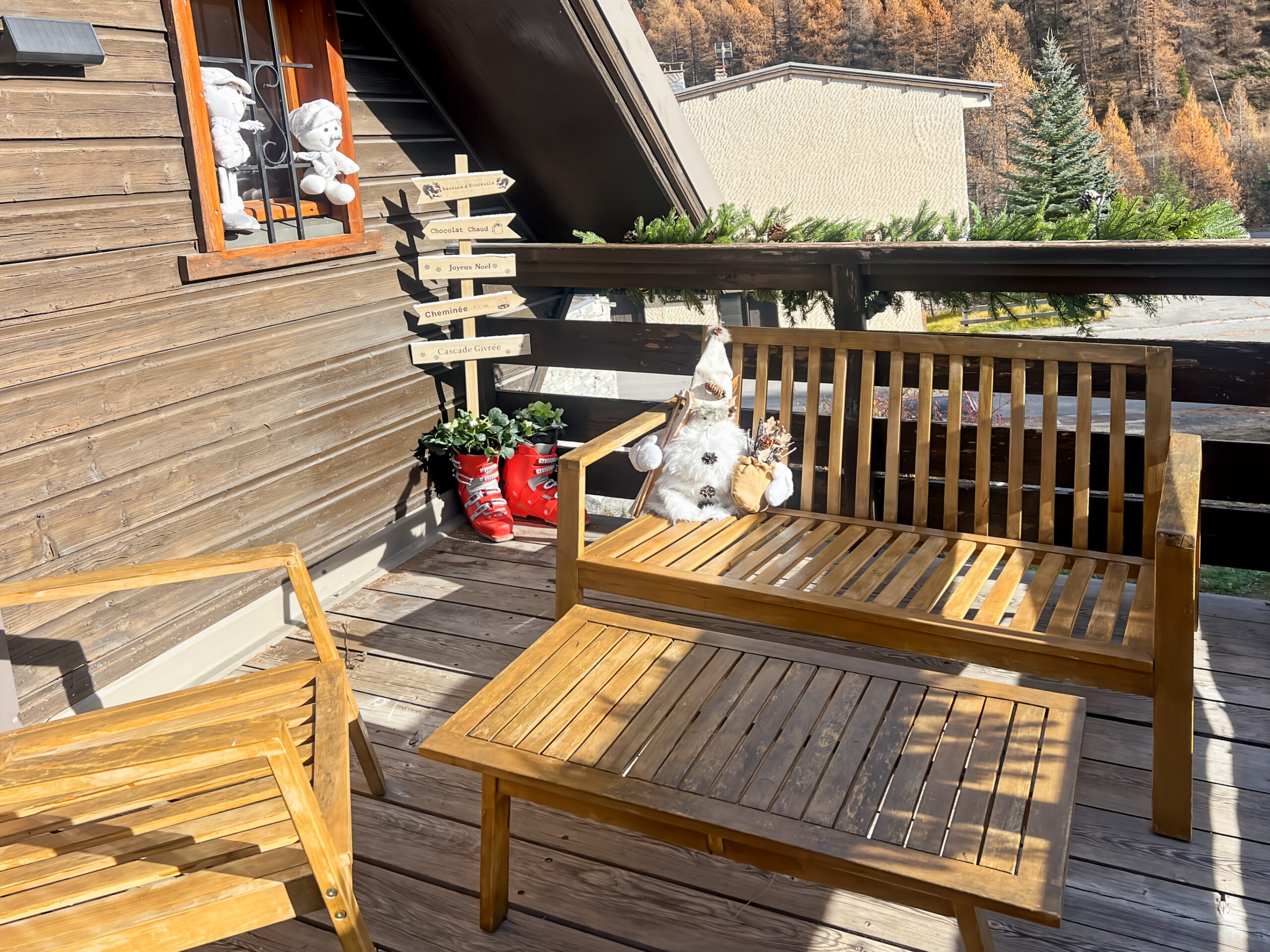 Vous apprécierez particulièrement la terrasse exposée au SUD face aux montagnes et ambiance chalet. Idéal pour les amateurs de café ou thé en terrasse.