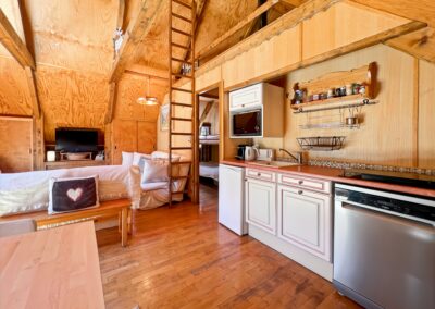 Côté repas une cuisine petite mais fonctionnelle qui se situe en face de la table à manger de 4 à 8 convives, avec banquette, chaises et banc.